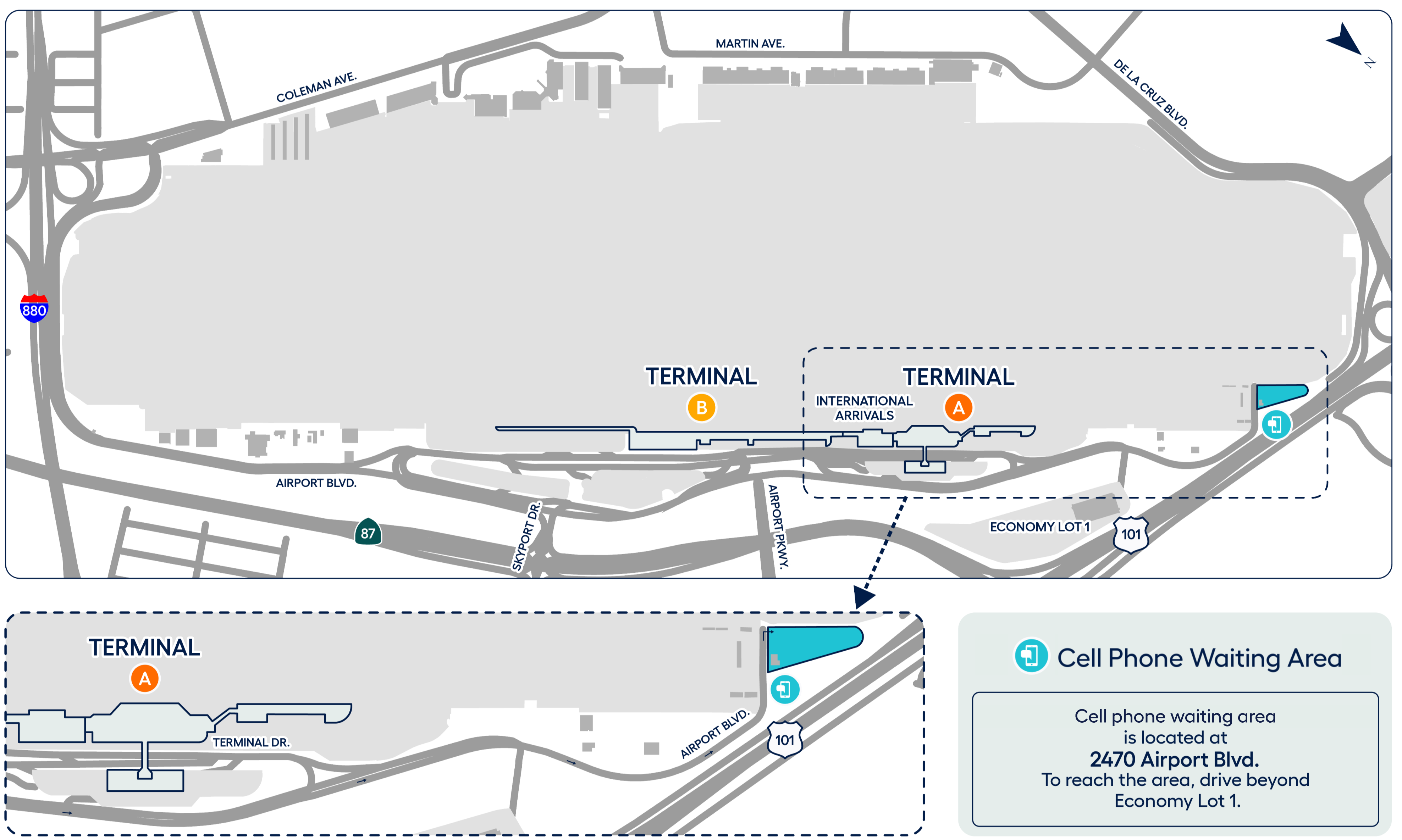 Cell Phone Waiting Area: 2470 Airport Boulevard